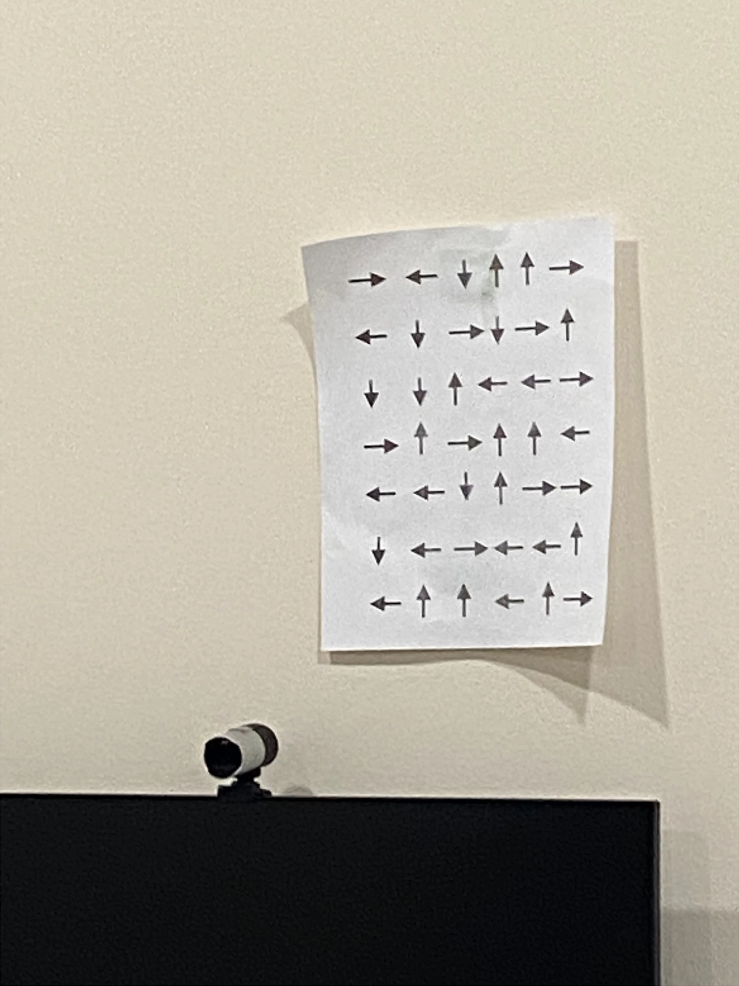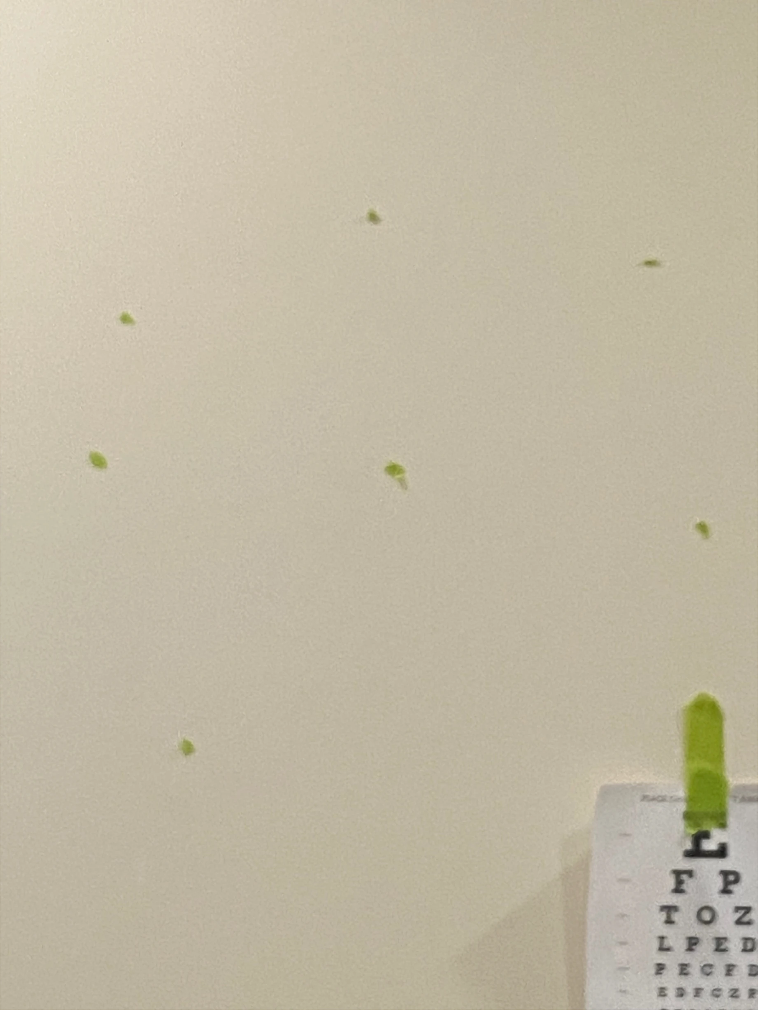 In Dr. Blanc’s room. Holding left hand over left eye while my right-hand points at a nickel size piece of green tape on the wall in front of me. The tape is in the center of a circular formation of other pieces of green tape. Dr. Blanc calls this her clock.